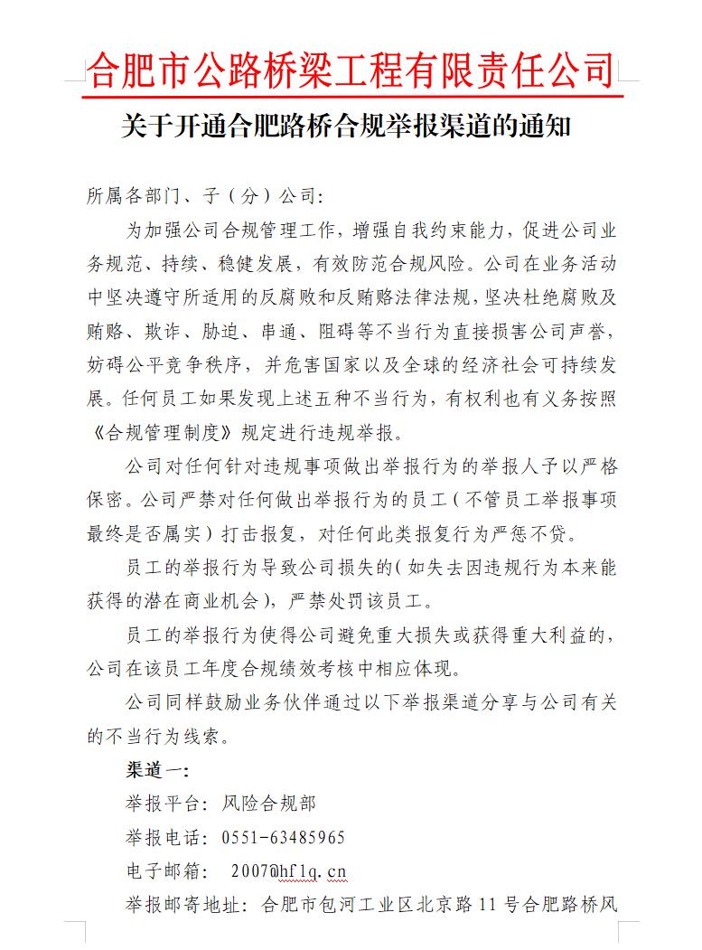 关于开通合肥路桥合规举报渠道的通知