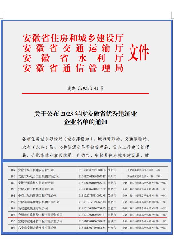 星空外围线上网站 > 星空外围线上网站 > 详细新闻近日,省住房城乡建设厅、省交通 运输厅、省水利厅、省通信管理局联合公布了2023年度安徽省优秀建筑业企业名单。经认定与公示,合肥路桥公司凭借卓越的工程质量、创新的技术实力和高度的社会责任感,荣获“安徽省优秀建筑业企业”殊荣。