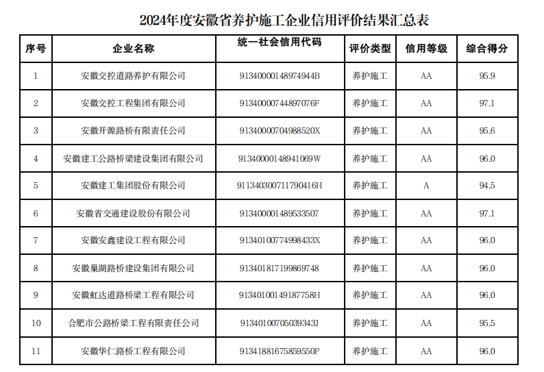 近日,安徽省交通运输厅公布2024年度全省公路水运工程信用评价结果,合肥路桥凭借在公路施工与养护施工领域的出色表现,同时斩获公路施工企业与养护施工企业信用评价双AA级荣誉。