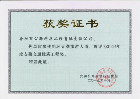 由合肥路桥公司承建的环巢湖旅游大道第一合同段,位于杭埠河大桥与白石天河大桥之间,起点桩号为K20+507.385,终点桩号为K25+306,路线全长5.5公里。环巢湖旅游大道为沥青混凝土路面。建设期间,公司不断加大先进技术和生产力的投入,有效确保了工程按时保质保量完成,并荣获安徽交通优质工程奖。