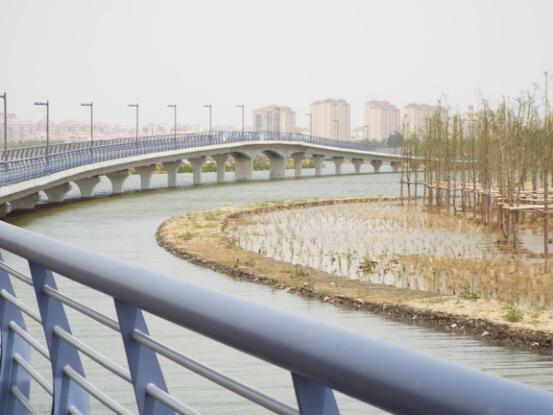 其中,桥梁工程: 6#、7#、8#三座桥梁为1孔13米简支梁桥,重力式砼桥台。新建1#、2#人行桥及迎宾桥桥面改造;驳岸工程:C20砼直立式现浇结构驳岸,驳岸外侧10米范围内河床整形;景观工程:景观亭2个,廊架16个,停车场2个,园路及汀步等。水上自行车道部分长1609米。