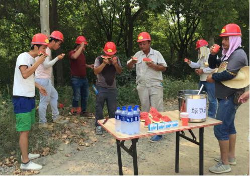 庐阳区大房郢路项目:为确保项目安全生产,立足施工现场实际,公司庐阳区大房郢路项目采取早开工、晚收工,项目现场搭建简易遮阳棚、设立临时饮水点帮助作业工人防暑降温,同时项目部还不定时采购西瓜等水果为广大职工防暑解暑。