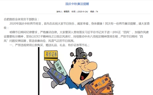 星空外围线上网站 > 党群廉政 > 详细新闻“2020年国庆中秋两节将至,首先在此祝大家节日快乐,阖家幸福,身体健康!其次有一份两节廉洁提醒,请大家查收。”