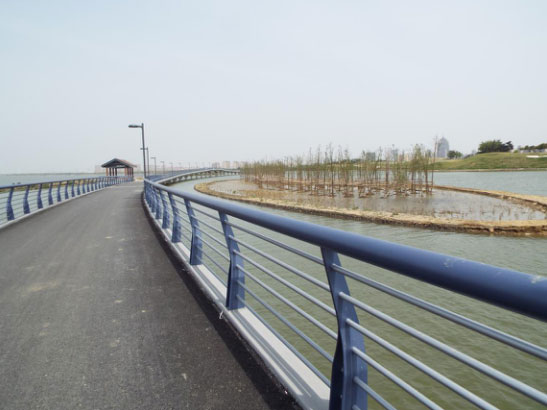 其中,桥梁工程: 6#、7#、8#三座桥梁为1孔13米简支梁桥,重力式砼桥台。新建1#、2#人行桥及迎宾桥桥面改造;驳岸工程:C20砼直立式现浇结构驳岸,驳岸外侧10米范围内河床整形;景观工程:景观亭2个,廊架16个,停车场2个,园路及汀步等。水上自行车道部分长1609米。
