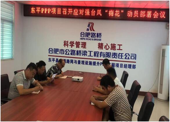 接到预警通知之后,东平县交通网络与景观设施提升PPP项目部主动出击,全力备战,快速进入防御状态。第一时间组织人员召开防台风动员部署会议,成立台风“梅花”应急领导小组,快速启动项目防台风应急预案;利用“人对人、点对点”方式对施工现场进行防台风工作部署,针对主要道路、重点区域进行安全隐患集中排查,第一时间排除活动板房、工棚等重点区域安全隐患;严格落实24小时值班和领导带班制度,做好应对准备工作,确保防汛物资、抢险装备和应急设施到位;利用“线上”和“线下”相结合的方式,及时发布台风预警信息,提醒各施工队伍做好应对台风的准备;同时,对易被风吹动造成再次伤害的物资、设备,进行集中封闭存放,全力以赴落实好防台风措施,筑牢“防风墙”,确保安全工作万无一失。